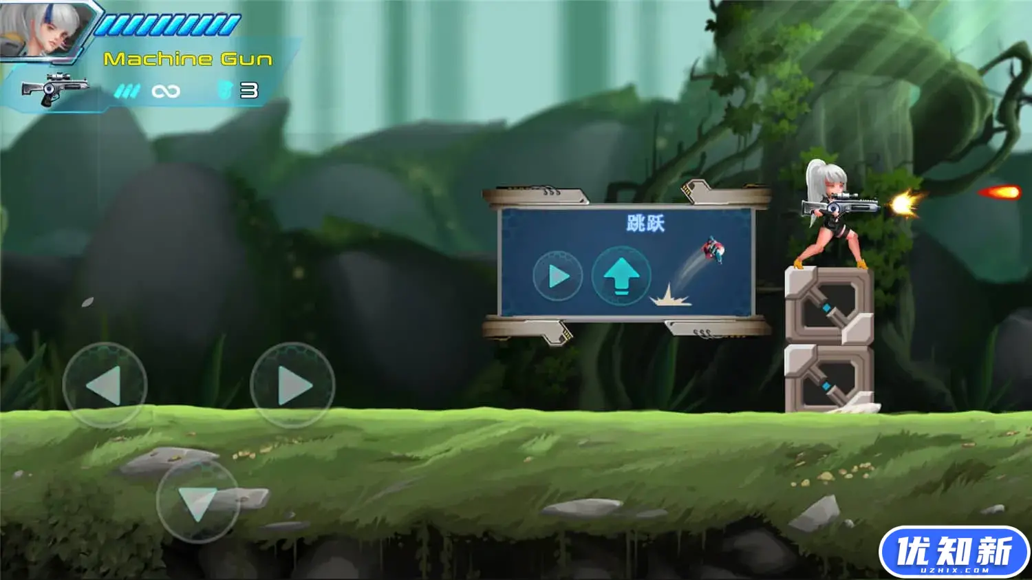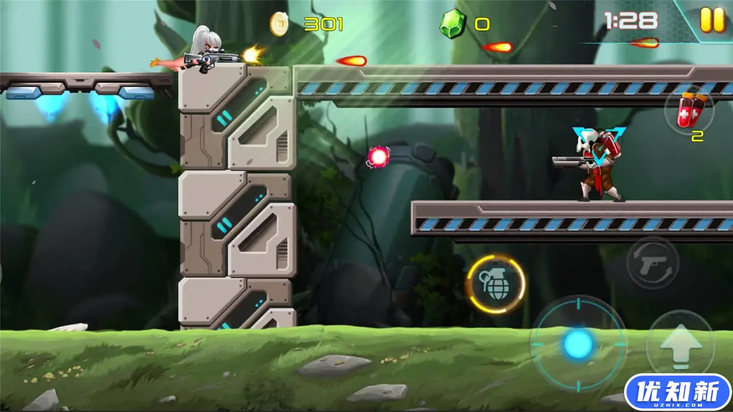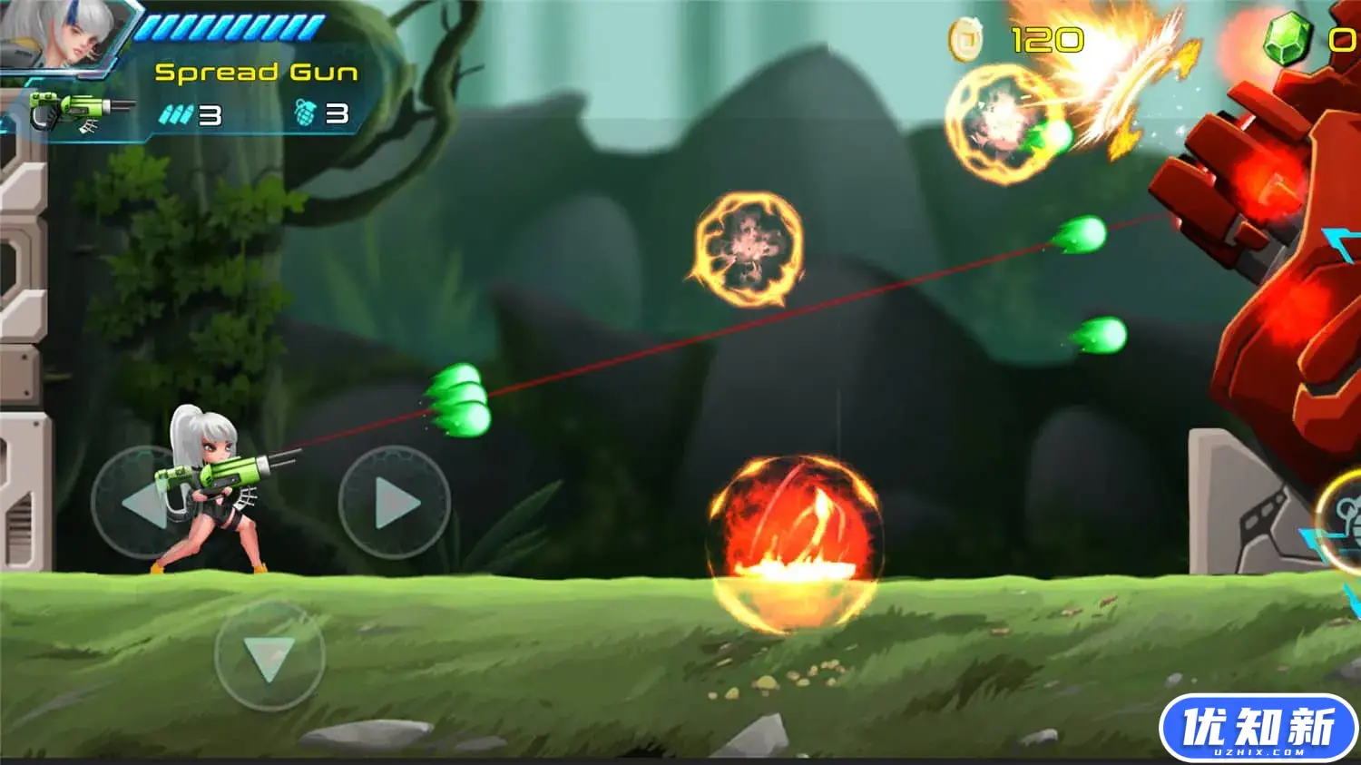 细腻画风和丰富动画,8方向跳跃射击、主枪火力品种全面、大威力抛物线手雷再加上强大的特殊武器,一个全能型的兰博式主角诞生了。 让玩家大呼过瘾的大量种类的武器!